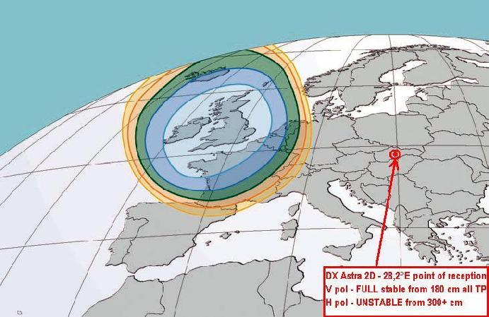 Na orbitálnej pozícii 28,2 a 28,5 ° sú umiestnené 4 satelity,ktoré sú v rôznych častiach EU dostupné s vysoko rozdielnou signálnou kvalitou medzi jednotlivými družicami Astra 2A-2B-Eurobird a v mieste príjmu tieto rozdiely môžu dosahovať aj 8 dB z MER a prax mi potvrdila vzájomnú súvislosť medzi týmito vysokými signálnymi rozdielmi z jednotlivých družíc a následnou signálnou kvalitou z družice Astra 2D - ktorá je samozrejme v celej európskej oblasti dostupná s najnižšou merateľnou MER,BER kvalitou prenosu.A práve šírka vyžarovacieho resp.príjmaciehio diagramu samotnej antény spolu s oddeleným polarizačných rovin Cross Polarisation má v konečnom dôsledku súvis s výslednou kvalitou signálu aj v slovenských podmiekach príjmu čo je nutné brať v úvahu na dosiahnutie maximálnej signálnej kvality .