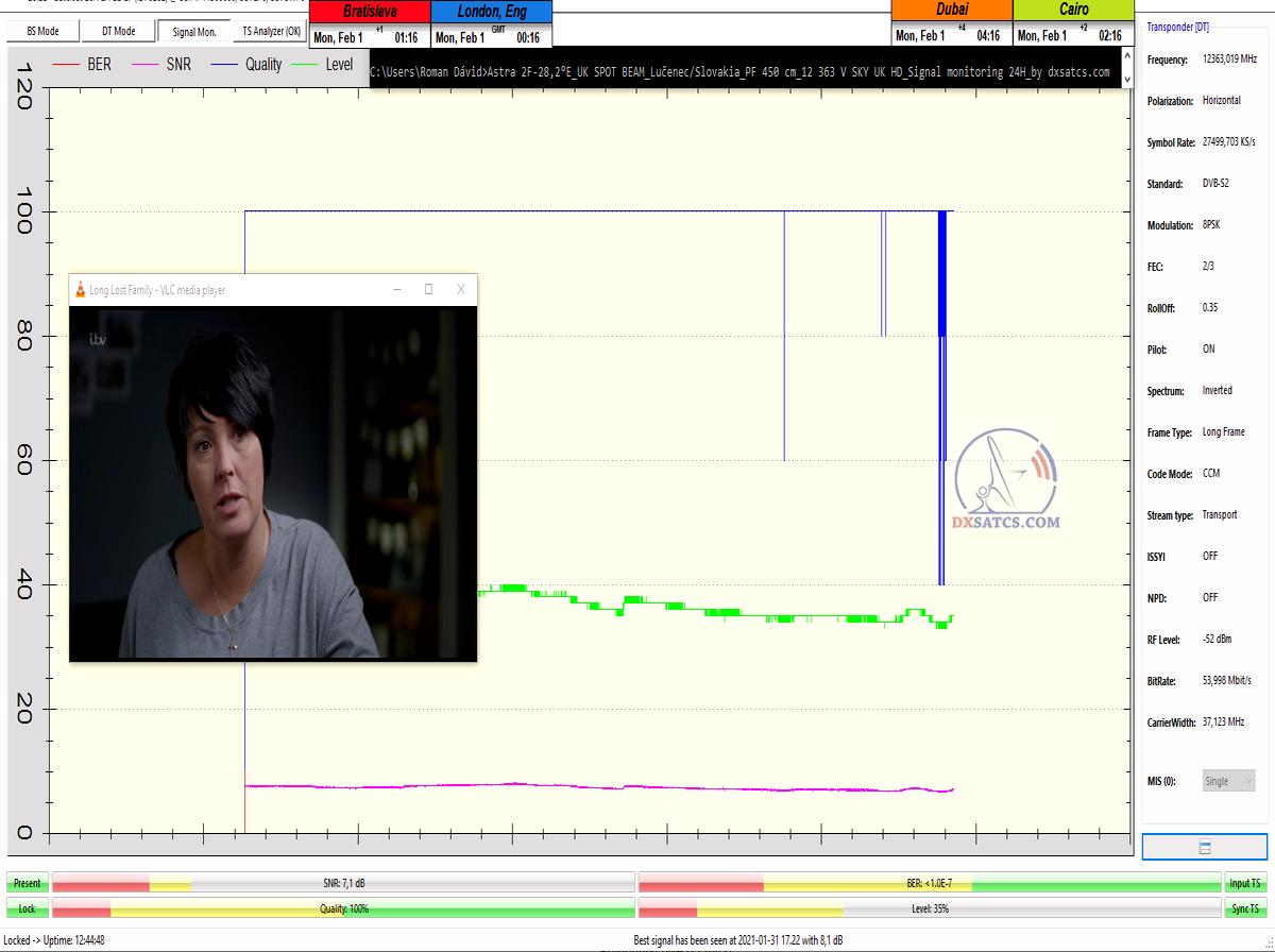 v dĺžke viac ako 24 hodín na HD transponére SKY UK vysielanom v štandarde DVB-S2/8PSK na f=12 363 MHz,čo v praxi znamená